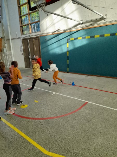 Tous les vendredis, on fait de l’athlétisme avec Florian. On apprend à faire des courses-relais avec un témoin.