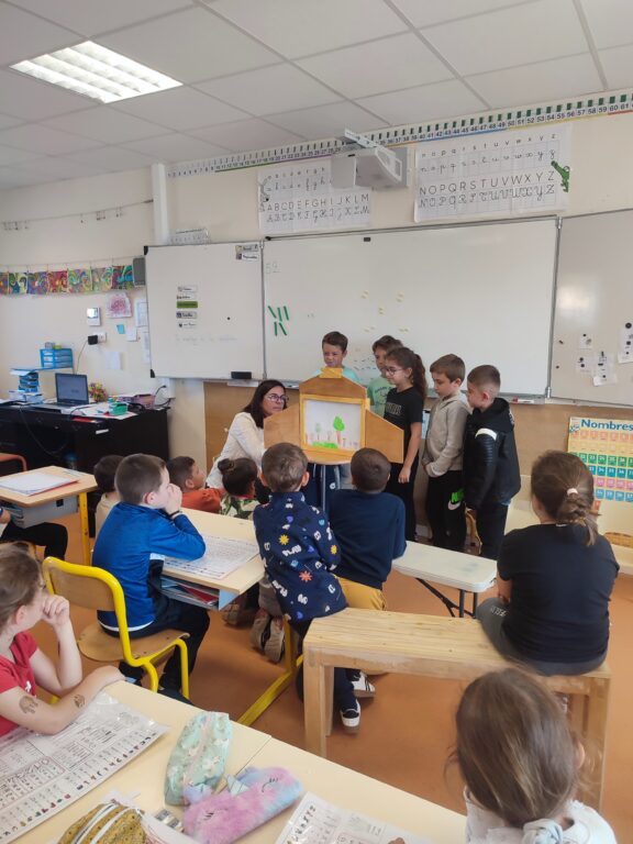 La classe de CE1/CE2 a présenté à toutes les classes son kamishibaï sur l’histoire des Trois Petits Cochons.